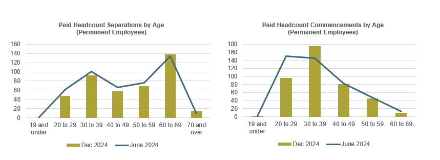 Of the 419 permanent employees who left the State Service in the quarter ending December 2024, a total of 413 (98.57%) resigned. The following charts show the number of permanent employees who left the State Service, and commencements with the State Service in the quarter ending December 2024 by age group and compared to the quarter ending June 2024.