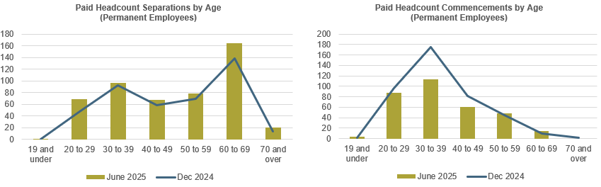 Of the 497 permanent employees who left the State Service in the quarter ending June 2025, a total of 483 (97.18%) resigned. The following charts show the number of permanent employees (by age group) who separated from or commenced with the State Service in the quarter ending June 2025, as compared to the quarter ending December 2024.