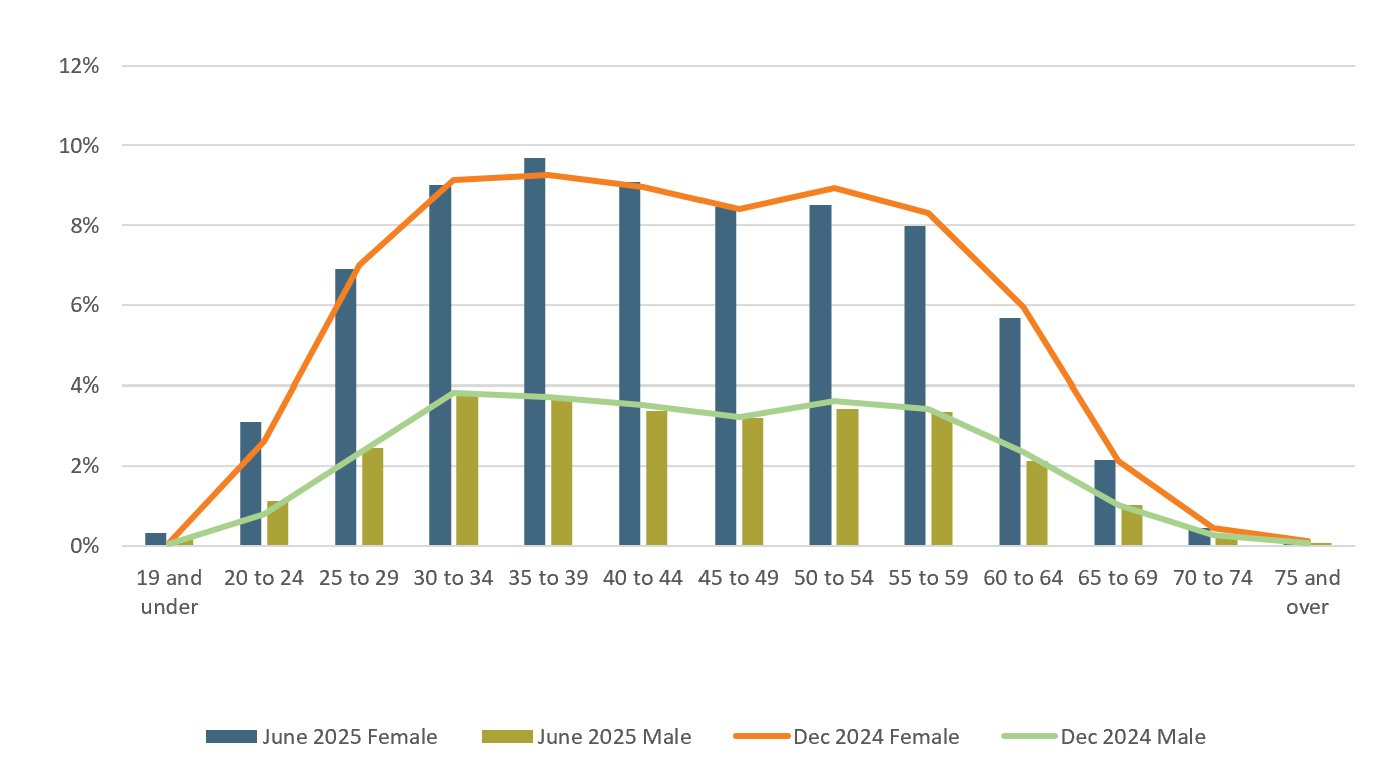 The gender balance shifted slightly between December 2024 and June 2025, with the percentage of female employees increasing from 71.39% to 71.58%, compared to the percentage of male employees which decreased from 28.36% to 28.14%. The remaining 0.28% represents employees who do not identify as either male or female or who have not disclosed their gender to their agency.